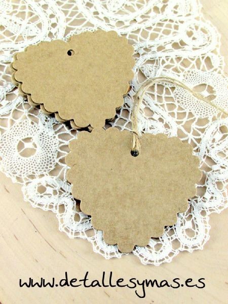 Paquete de 10 Tarjetas de cartón kraft grueso de 350 gr en forma de corazón con los bordes en ondas. Para personalizar a mano o con sellos . Miden 6,5 x 6 cms