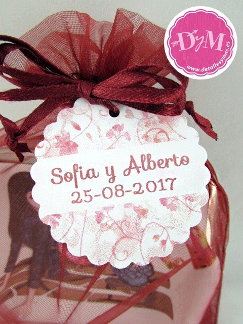 . Preciosas tarjetas para detalles de boda en suaves tonos rojos que personalizamos con los nombres de los novios y fecha.