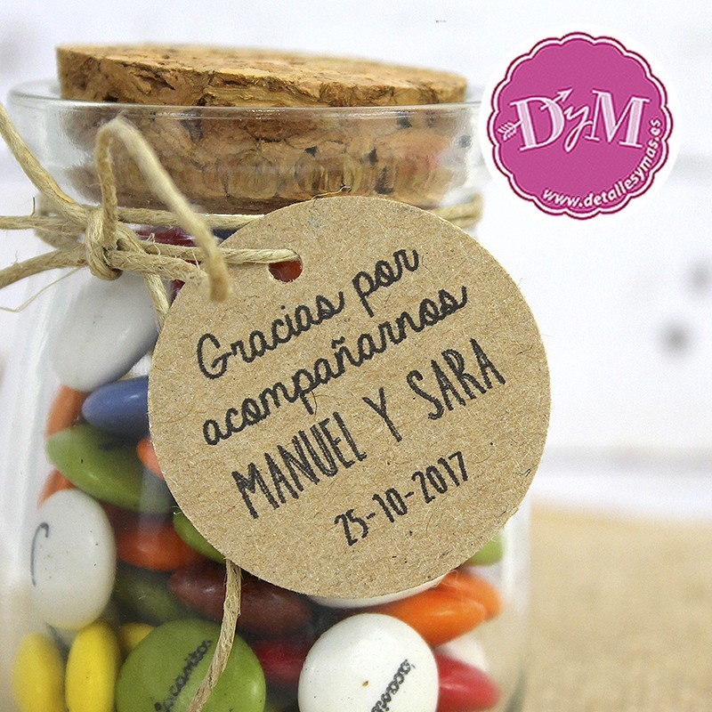 Tarjetas redondas en cartón kraft personalizadas con los nombres de los novios y un frase de agradecimiento "Gracias por acompañarnos" .